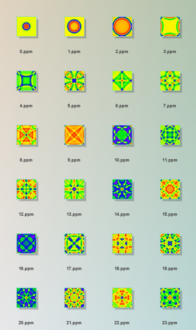 octave> h=gaussian1d(64,32,3.0); octave> drum(h*h',h*h',100,1,0.005,3); % Click on picture to see animation!