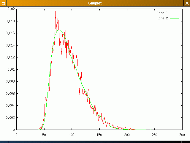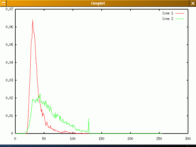 octave> gh=histogram(g/2,256); octave> gh=gh/sum(gh); # make it a pmf octave> ch=histogram(c/2,256); octave> ch=ch/sum(ch); # make it a pmf octave> mplot(0:255,gh,0:255,ch);